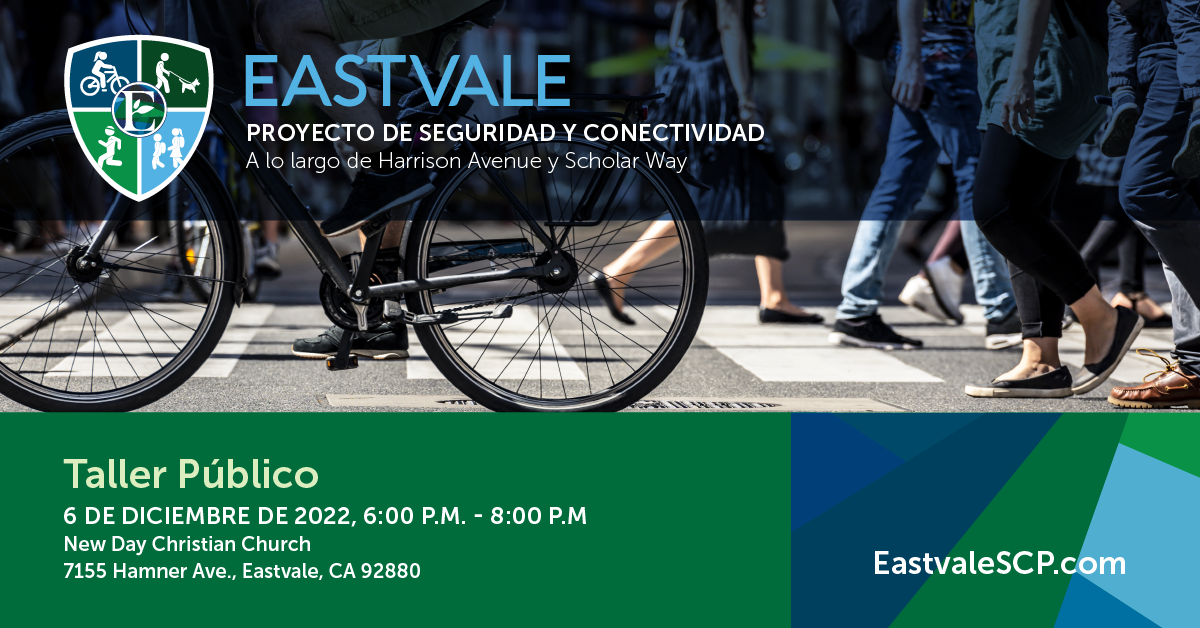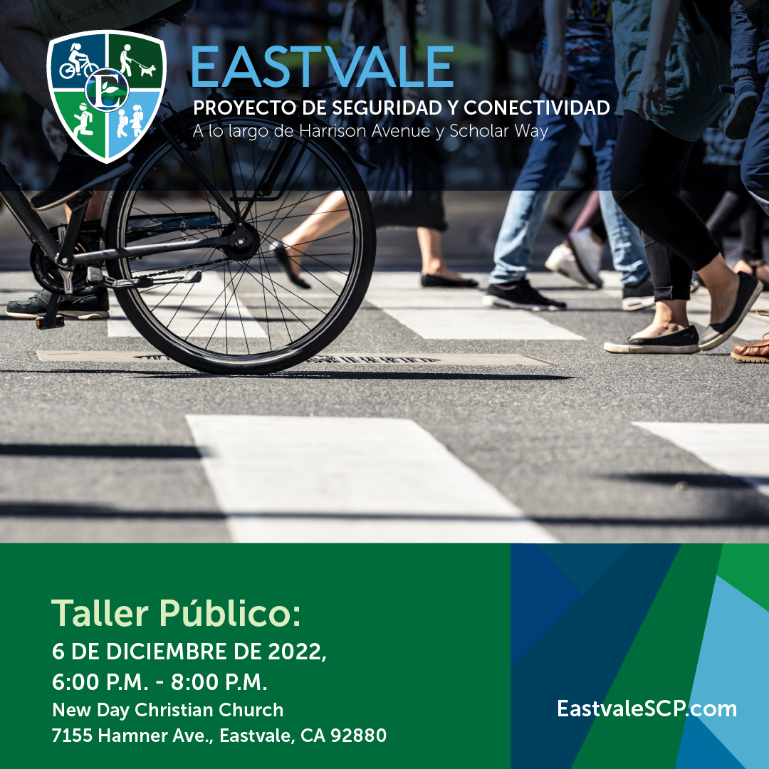 El Proyecto de Seguridad y Conectividad de la @City of Eastvale CA, celebrará un taller público de “Puertas Abiertas” el martes 6 de diciembre de 6-8pm. Venga a conocer más sobre este proyecto de transporte activo en su área. Encuentre más detalles en www.eastvalescp.com.