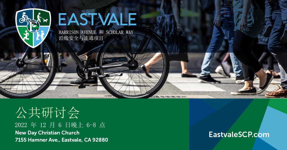 加州 @City of Eastvale 安全性和连通性项目将于 12 月 6 日(周二)晚上 6 点至 8 点举行现场公共研讨会。敬请参会详细了解所在地区这个主动交通项目!如需更多信息,请访问 www.eastvalescp.com。